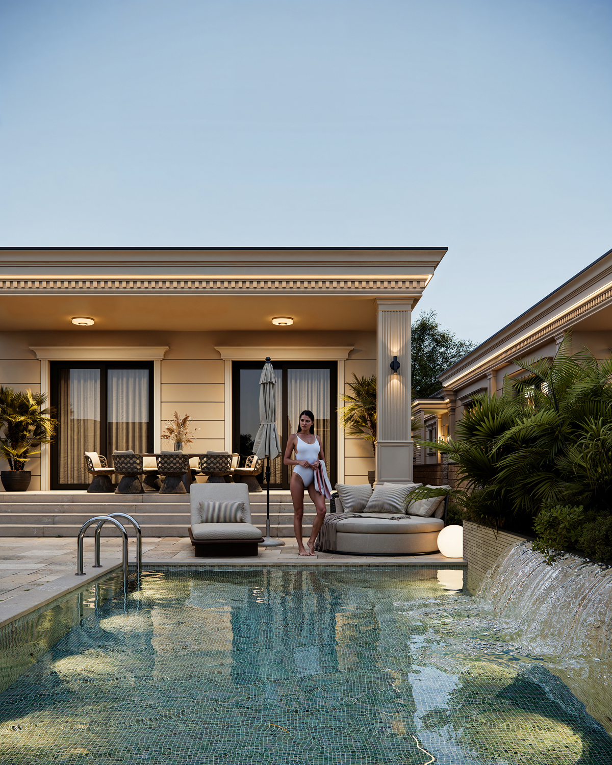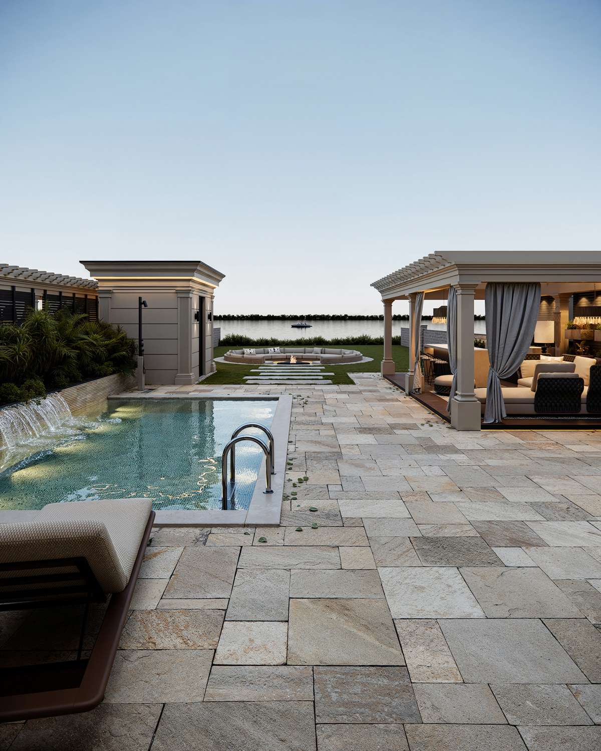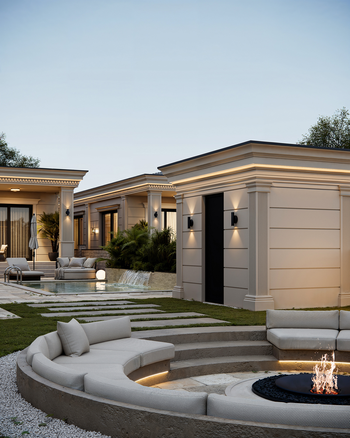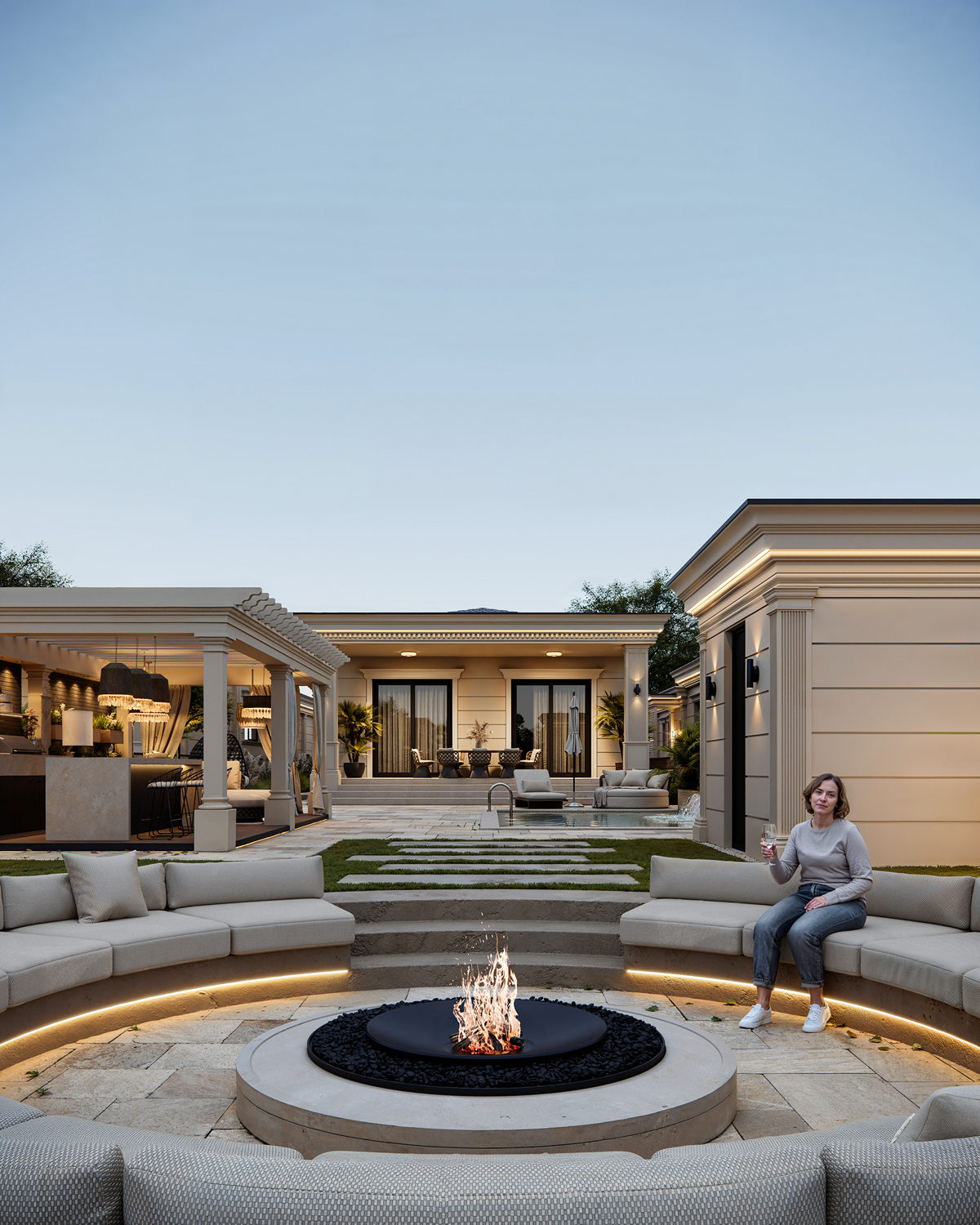 Outdoor areas function as direct continuations of the interior. Sunken fire pits, shaded dining terraces, small pools and pergolas create a series of open air rooms used throughout the day. Indoors, the palette is intentionally minimal: polished stone, soft neutral surfaces and discreet lighting maintain a consistent spatial tone and a calm visual flow.