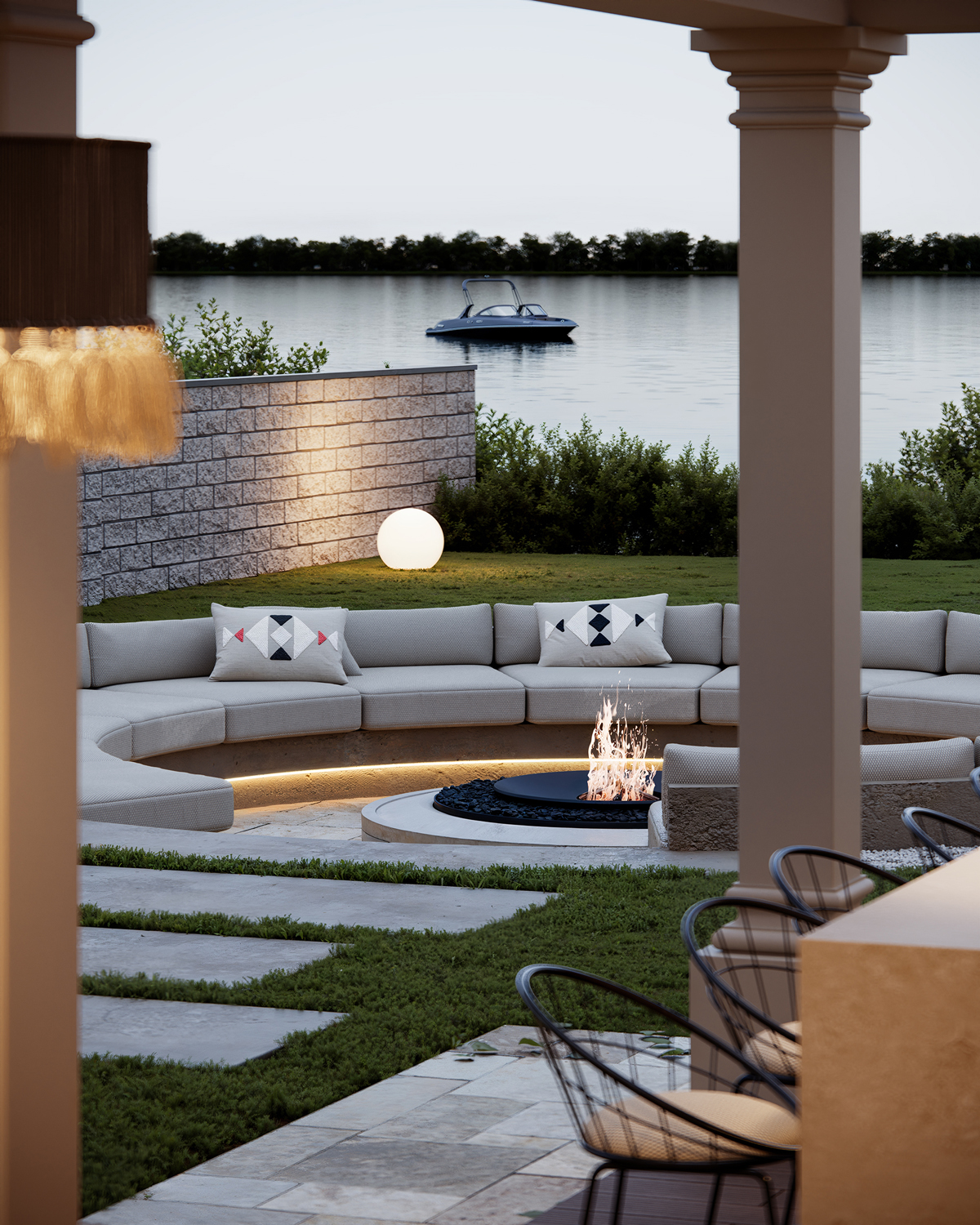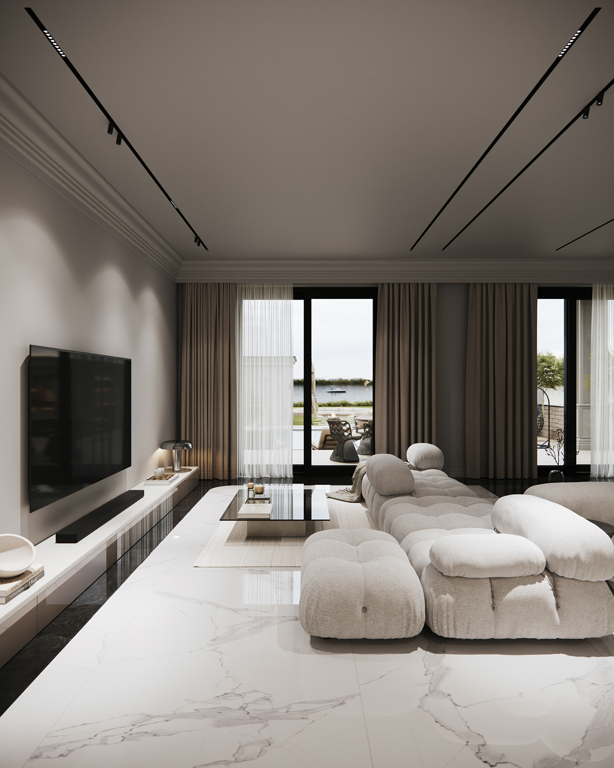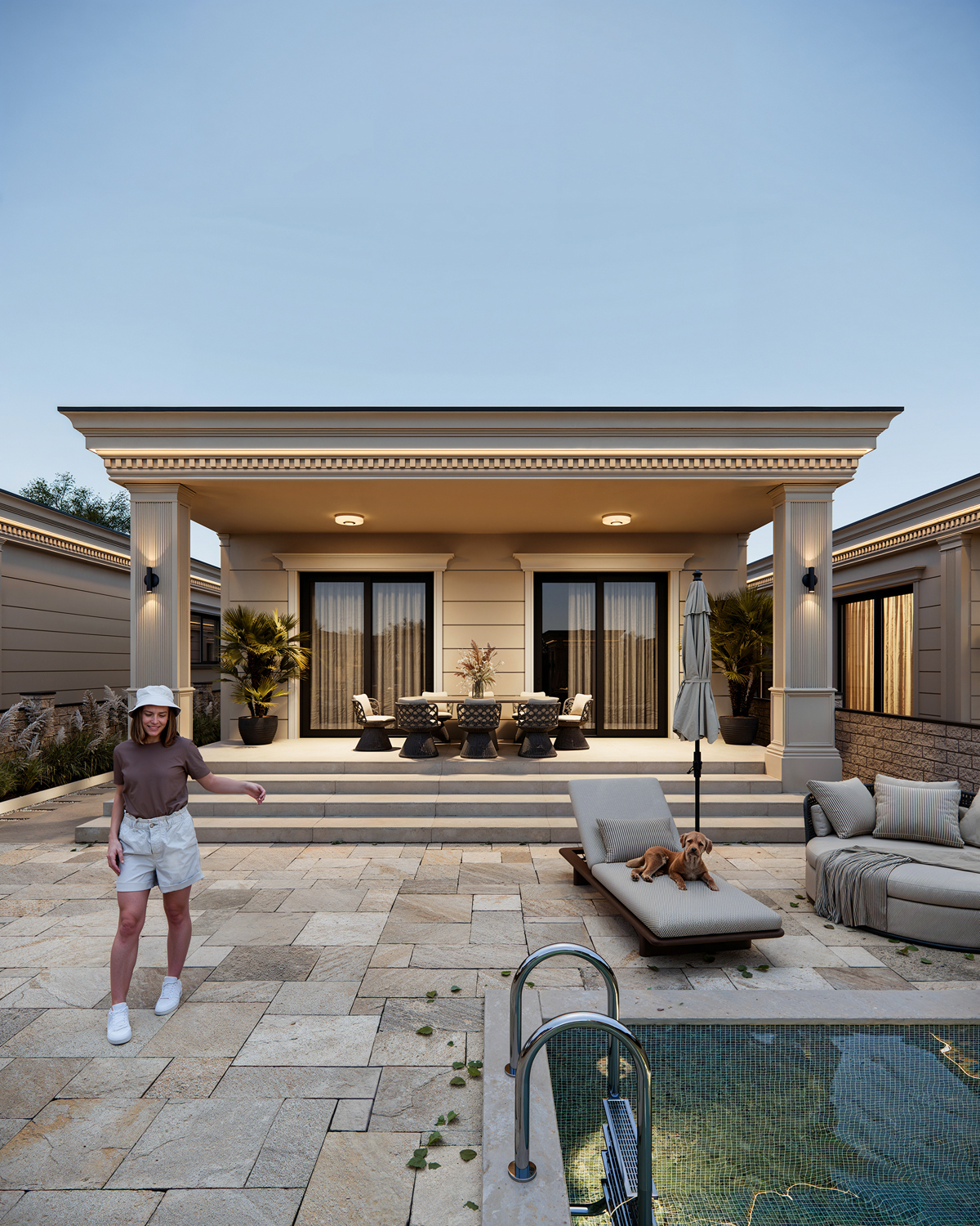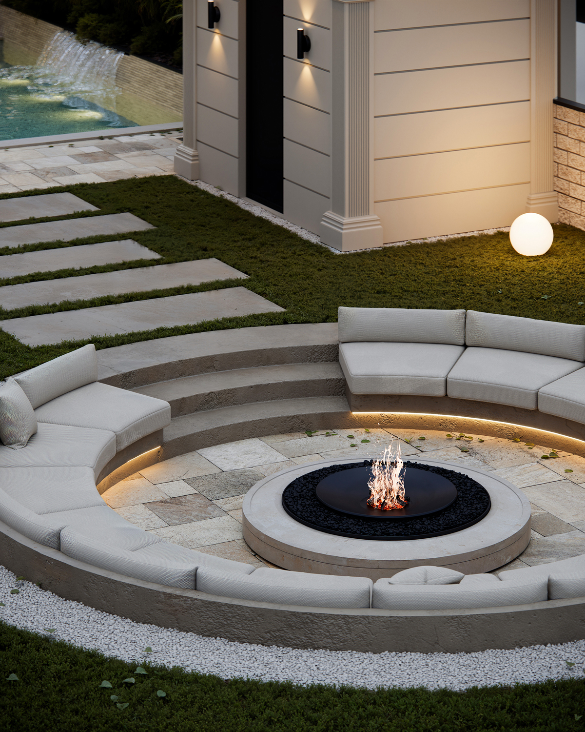 Outdoor areas function as direct continuations of the interior. Sunken fire pits, shaded dining terraces, small pools and pergolas create a series of open air rooms used throughout the day. Indoors, the palette is intentionally minimal: polished stone, soft neutral surfaces and discreet lighting maintain a consistent spatial tone and a calm visual flow.