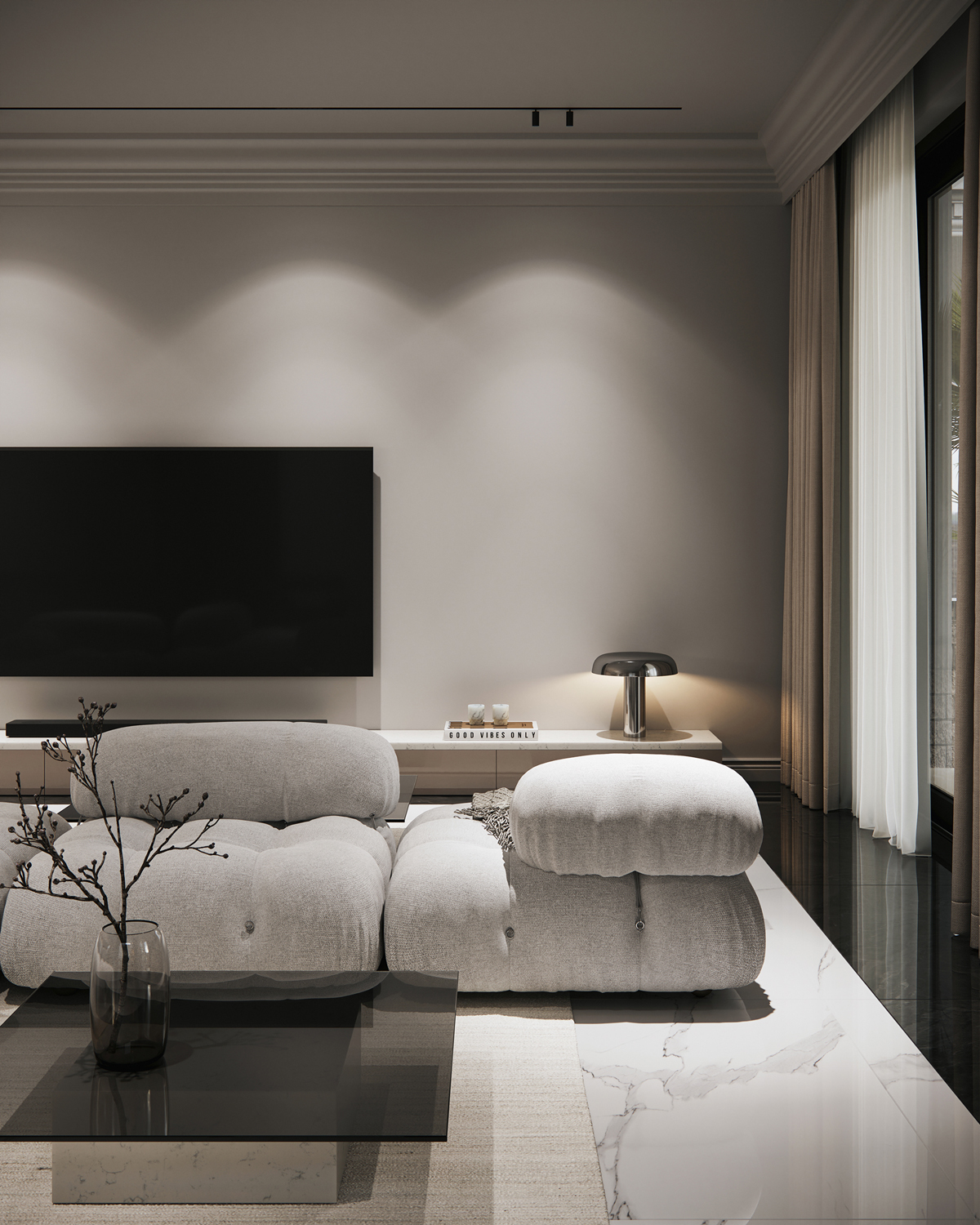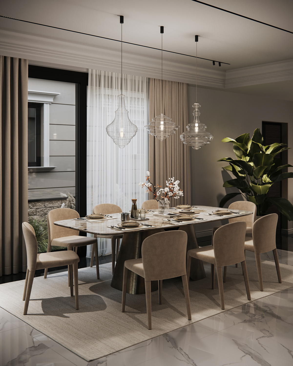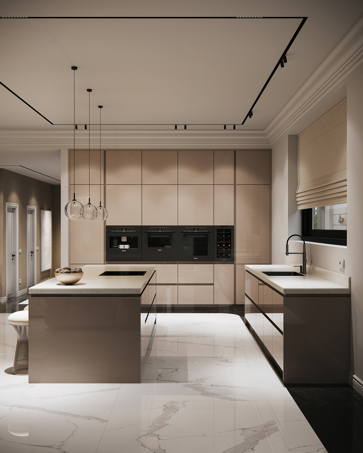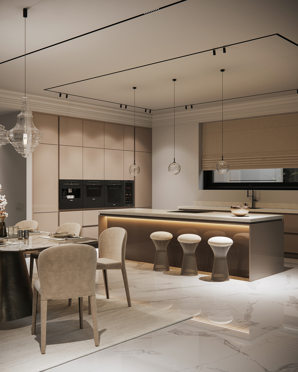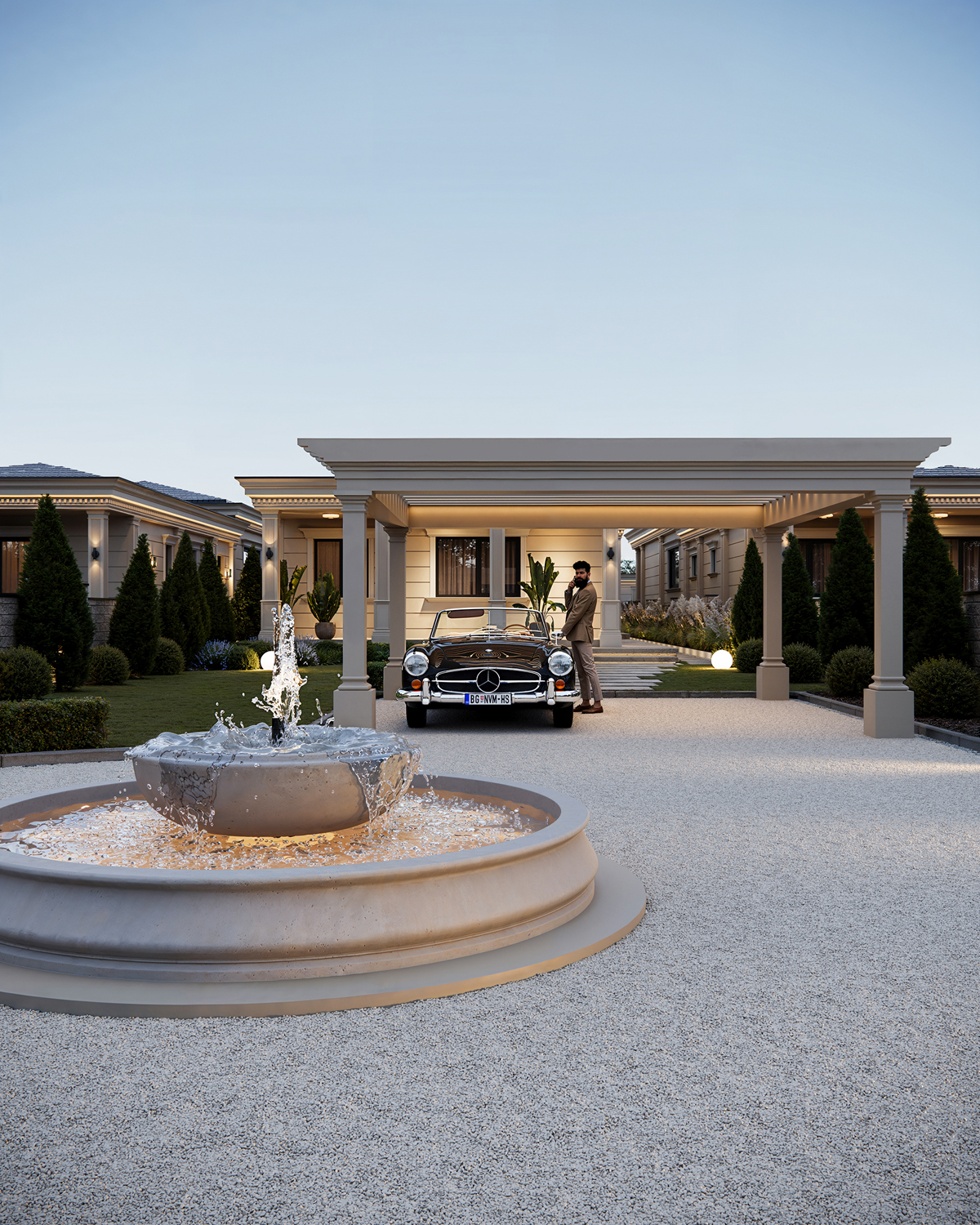 Outdoor areas function as direct continuations of the interior. Sunken fire pits, shaded dining terraces, small pools and pergolas create a series of open air rooms used throughout the day. Indoors, the palette is intentionally minimal: polished stone, soft neutral surfaces and discreet lighting maintain a consistent spatial tone and a calm visual flow.