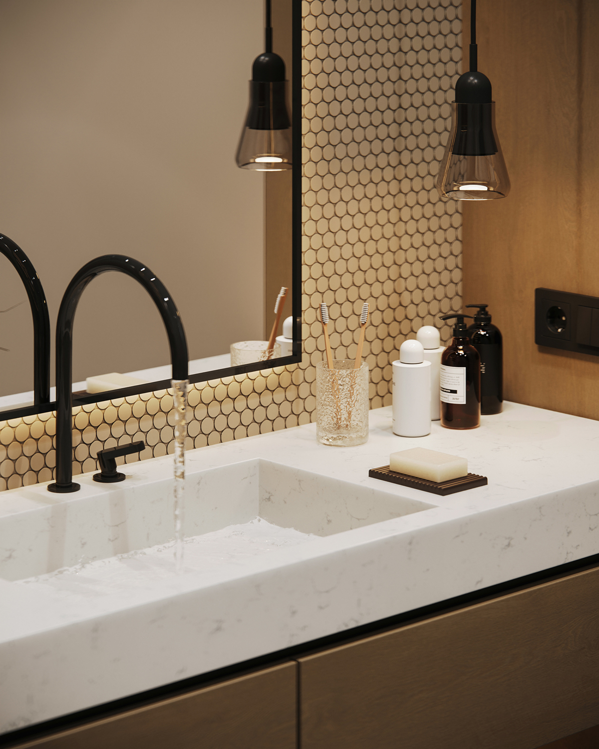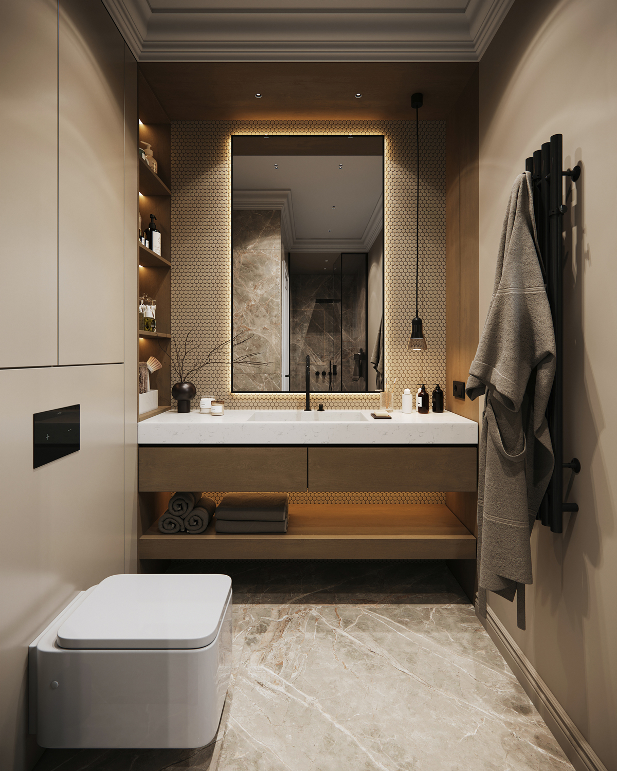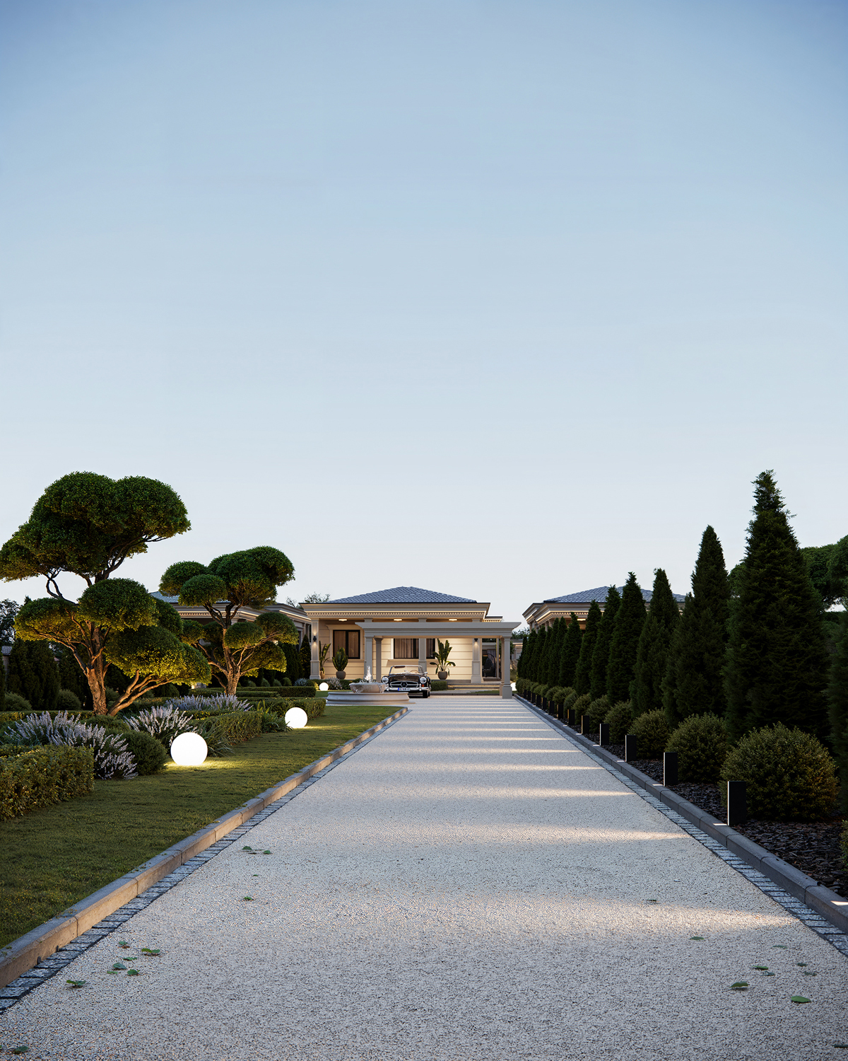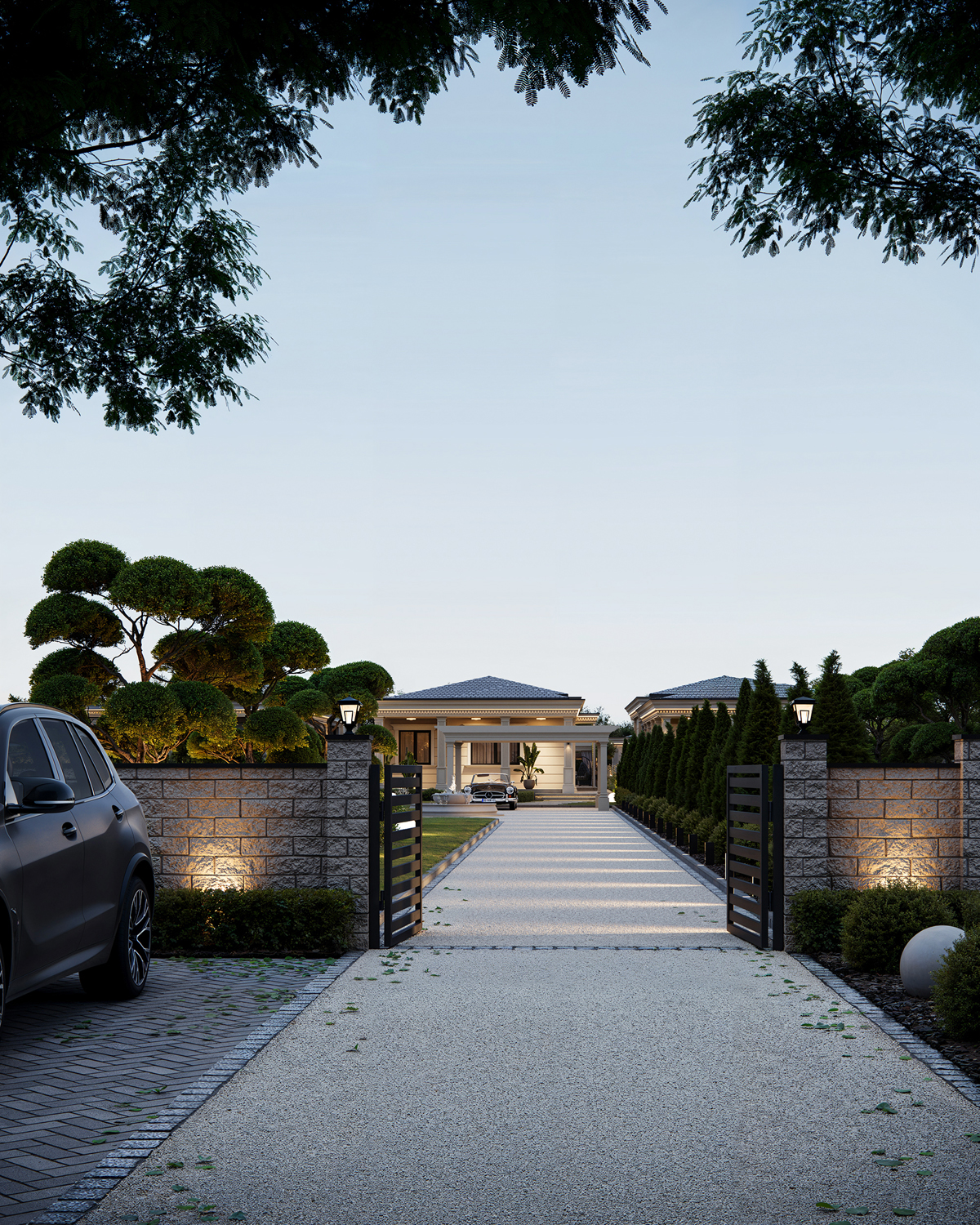 Outdoor areas function as direct continuations of the interior. Sunken fire pits, shaded dining terraces, small pools and pergolas create a series of open air rooms used throughout the day. Indoors, the palette is intentionally minimal: polished stone, soft neutral surfaces and discreet lighting maintain a consistent spatial tone and a calm visual flow.