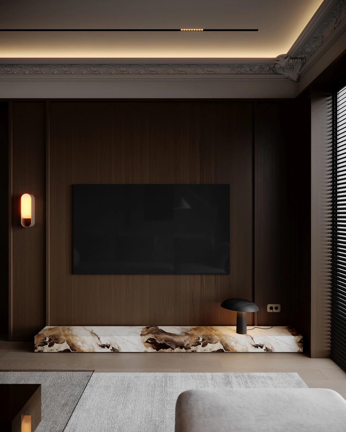 Apartment B is designed with a calm and measured look. The living area uses muted colours, clean surfaces and low furniture, keeping the space ordered and easy to read. Wood panels and soft lighting give it a steady, grounded feel without turning anything into a focal point.