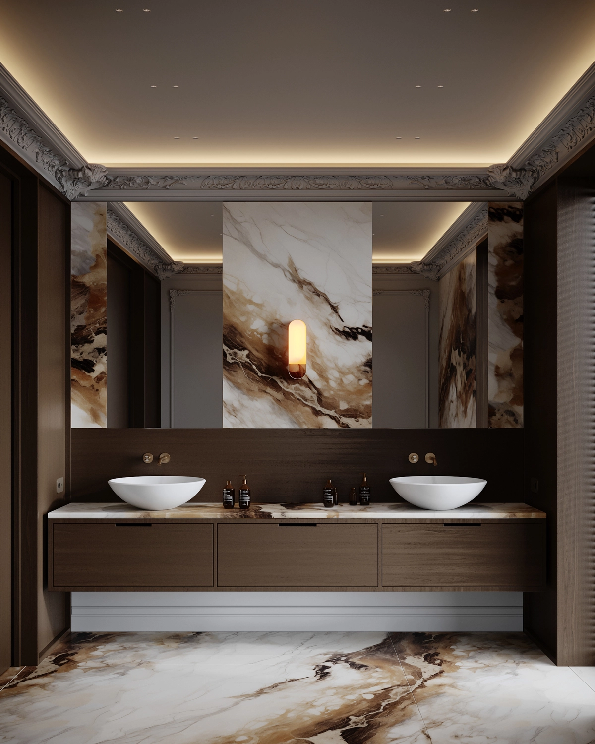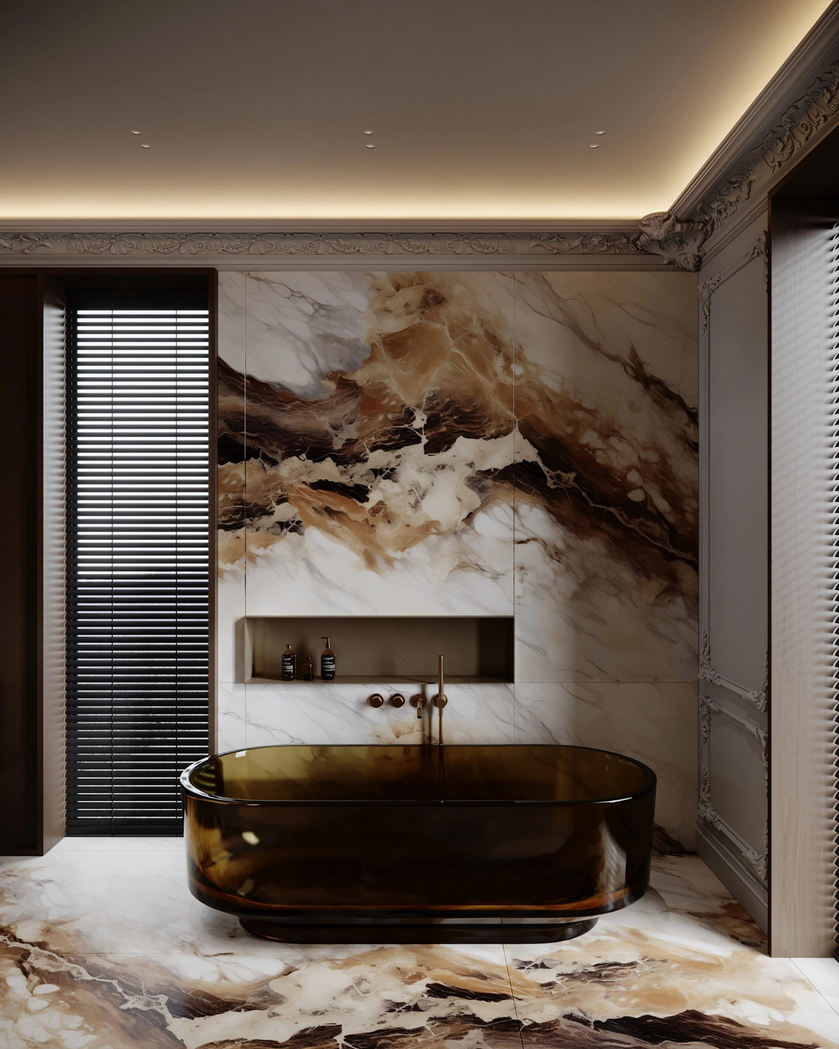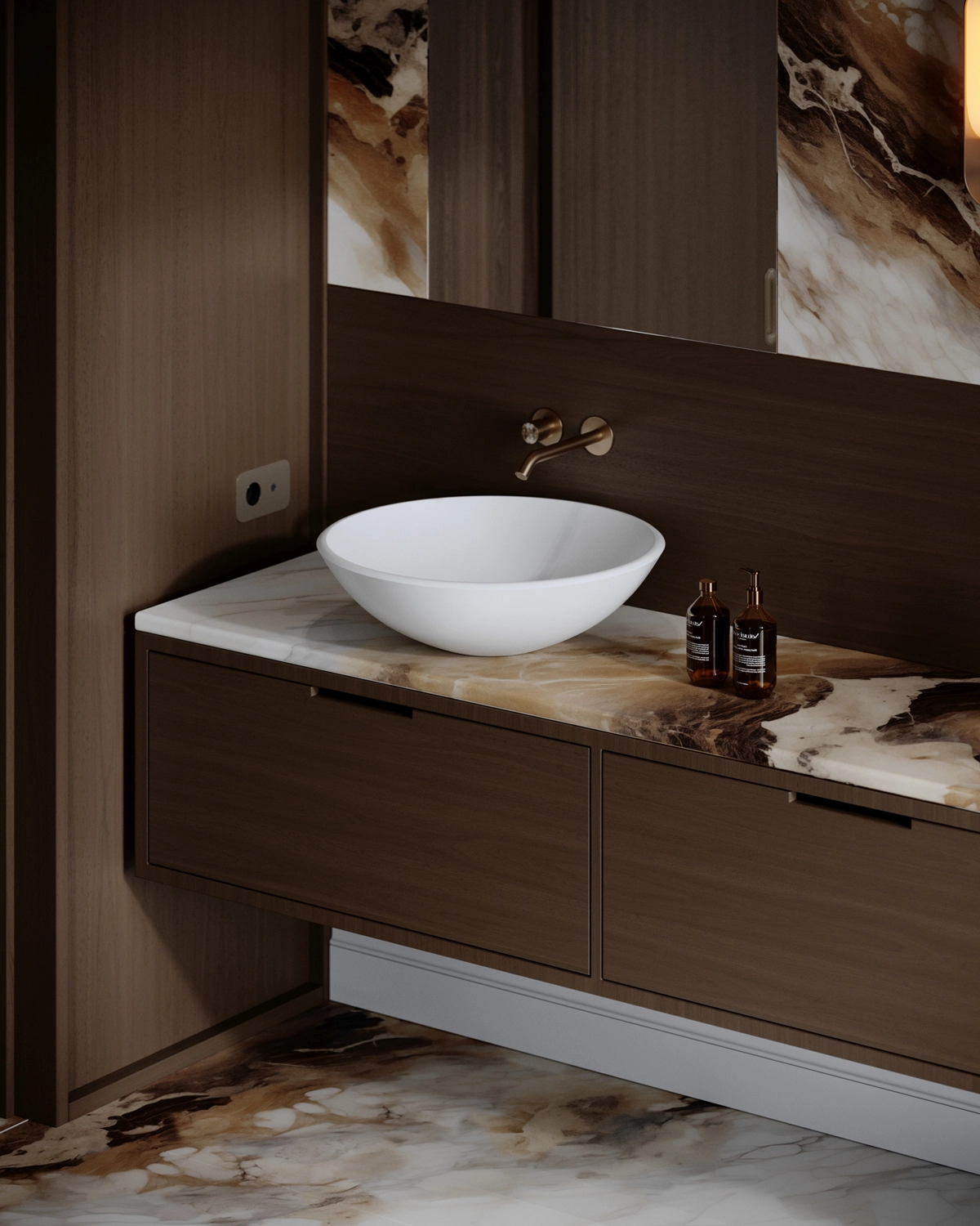 Stone surfaces, glass elements and uncluttered detailing define the bathroom. The space reads as luxurious without relying on excess – just clear geometry, good materials and measured contrast.