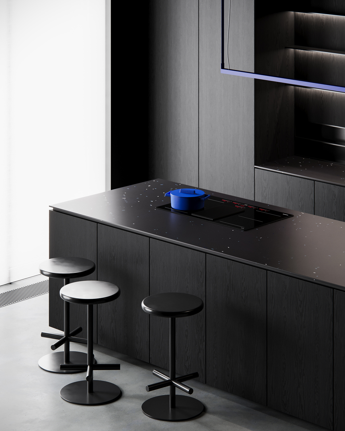 The kitchen establishes the tone: matte black cabinetry, coarse-textured wood and a monolithic island set against a concrete floor. A thin blue light frame introduces the project’s only vivid accent, echoed later in the seating, bathroom fixtures and lighting details. Every appearance of this color is intentional, used sparingly to guide the eye.