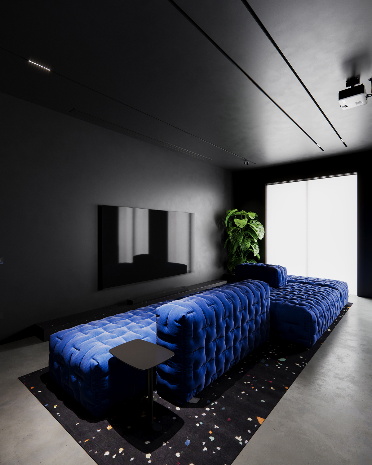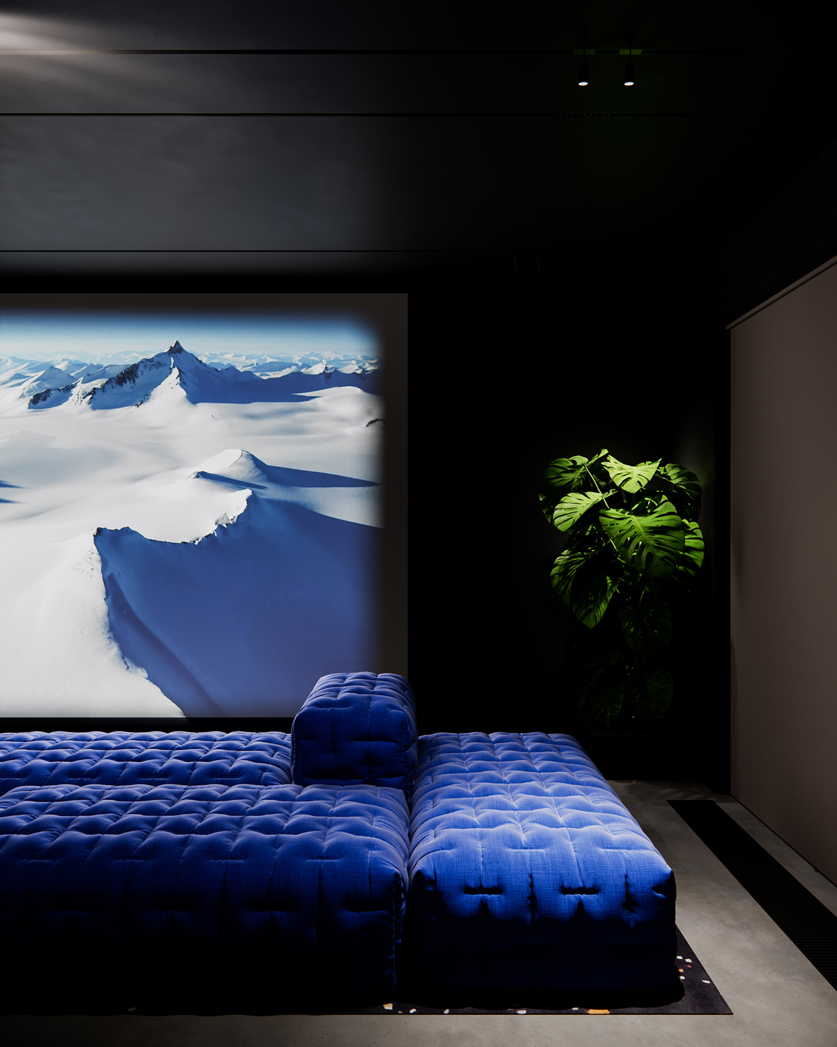 In the living area, the elongated blue sofa becomes the spatial anchor absorbing light and creating a soft counterpoint to the otherwise restrained palette. The room is kept deliberately dark to enhance projection quality and to emphasize the contrast between fabric, shadow and the reflective surfaces around it.
