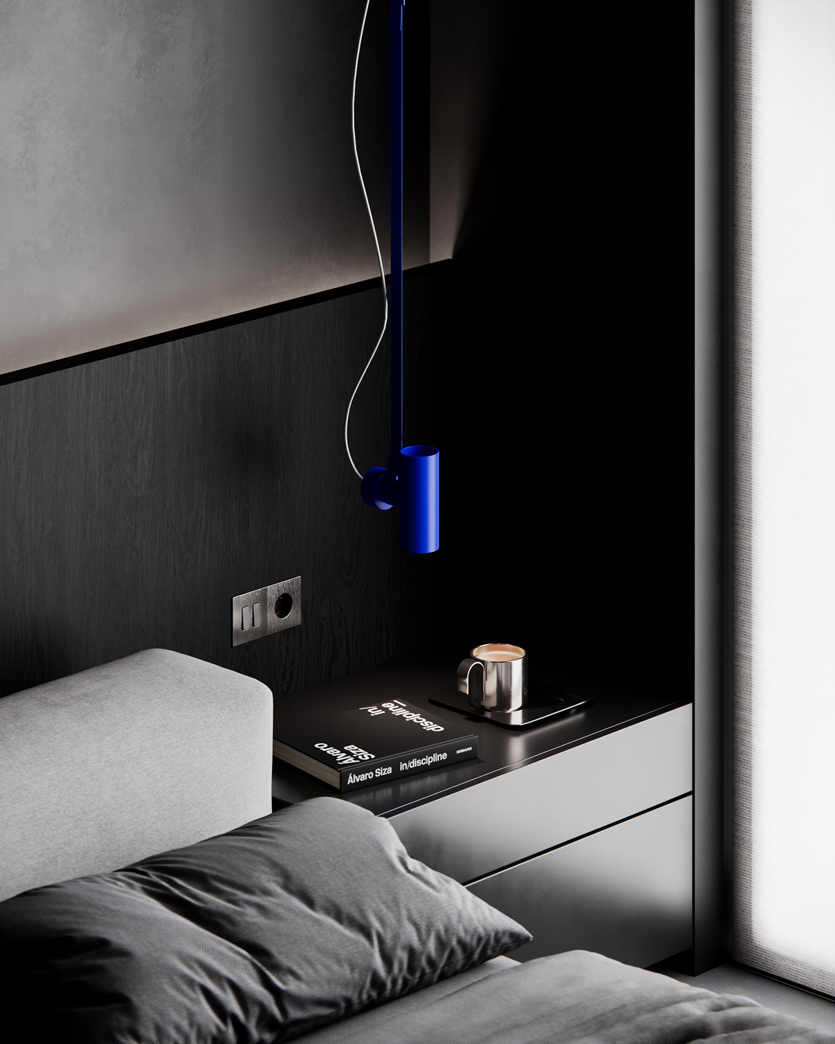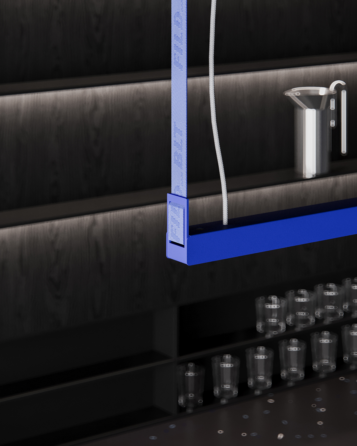 The bedroom takes a quieter approach, using black timber, low lighting and a minimal arrangement to preserve a sense of calm. Here the blue returns only as a subtle vertical line, maintaining continuity with the rest of the project.