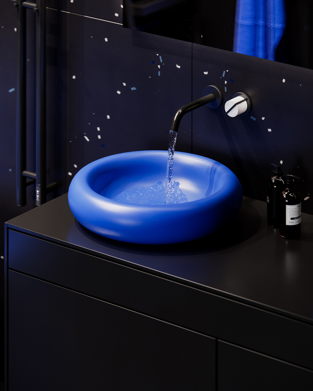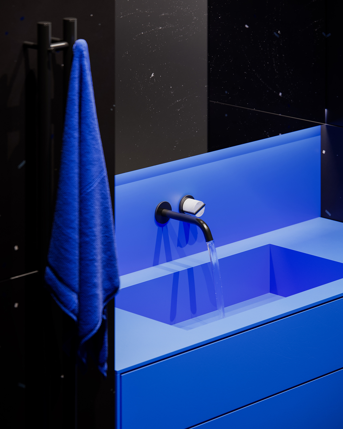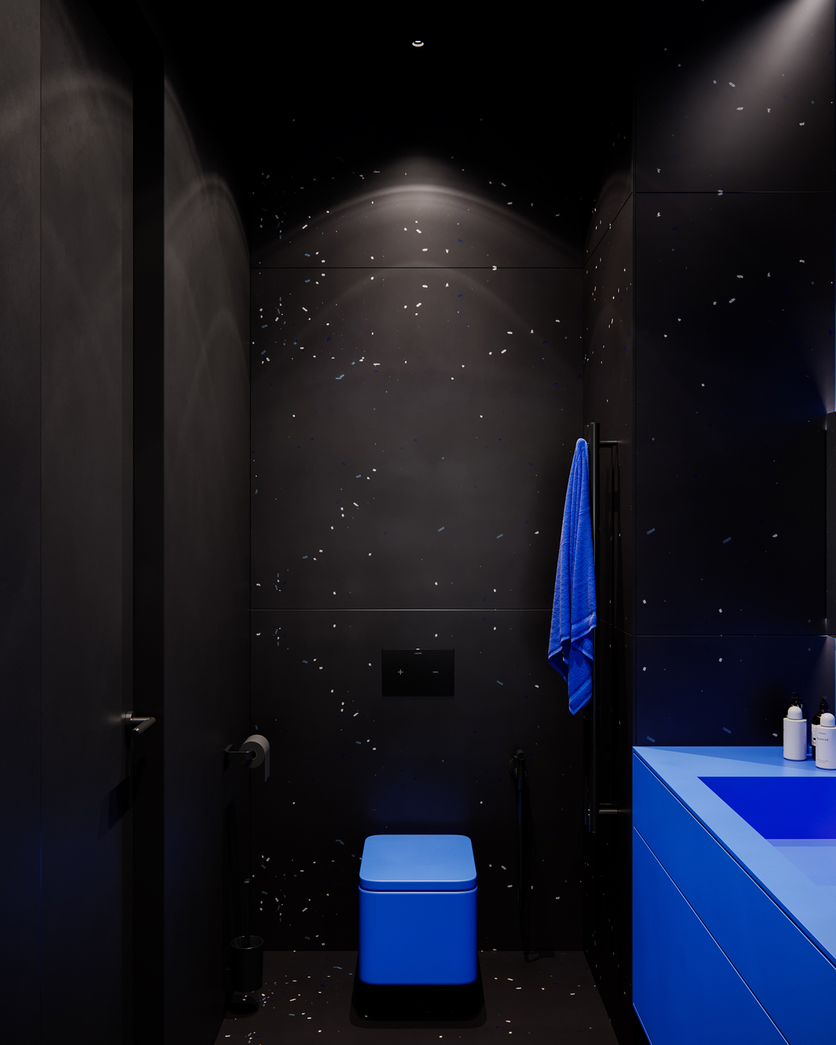 The bathrooms follow the same logic but with a stronger graphic presence. Deep black walls with scattered speckles frame solid, intensely blue volumes – the basin, the tub, the cabinetry giving the space a distinct identity without relying on ornament.